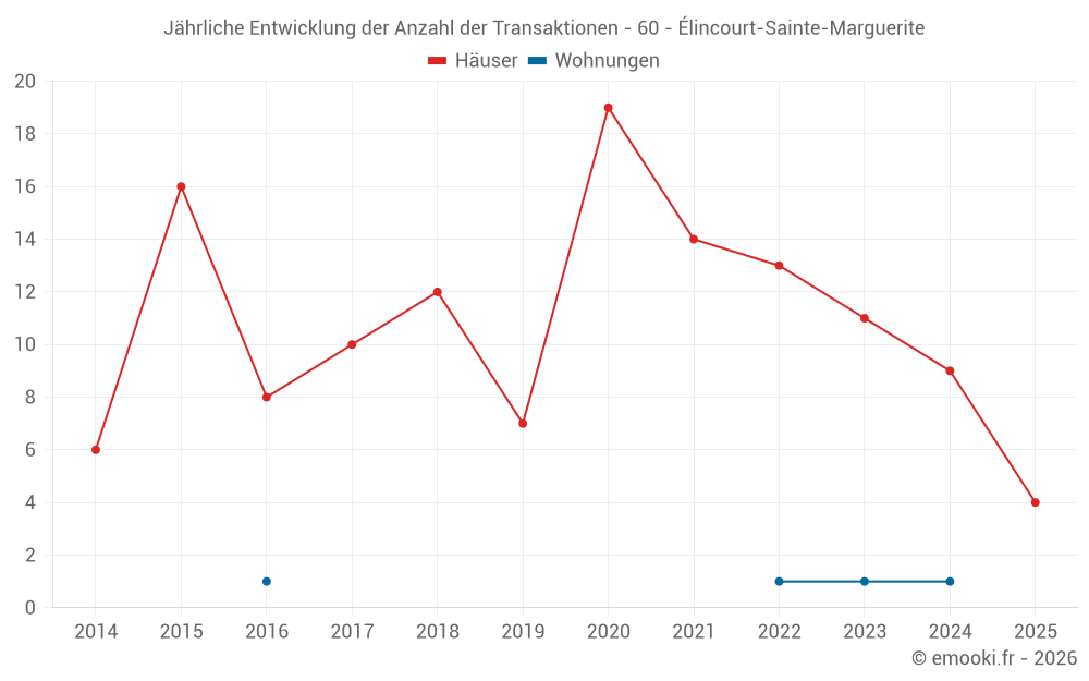Der Durchschnittspreis auf den 17 Hausgeschäften der letzten 24 Monate in der Gemeinde Élincourt-Sainte-Marguerite betrug 2 065 € pro Quadratmeter für einen mittleren Immobilienwert von 190 000 €. Über diesen Zeitraum hinweg lagen 60% der Transaktionen zwischen 1 059 und 2 799 € pro Quadratmeter (vom 2. bis zum 8. Dezil).