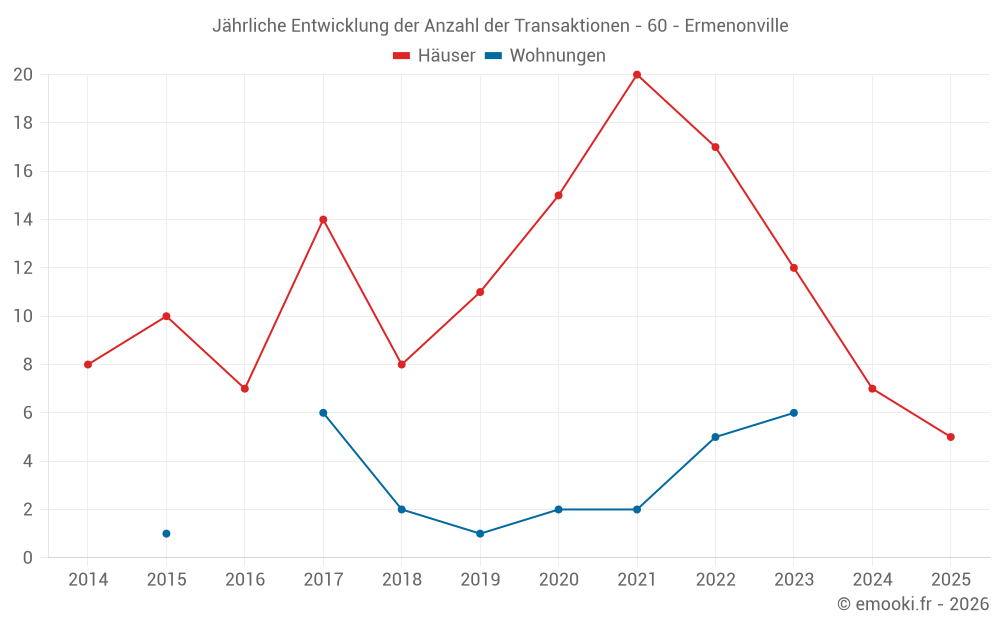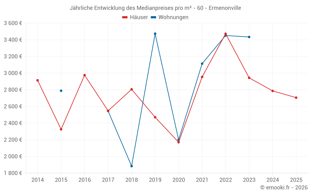 Der Durchschnittspreis auf den 16 Hausgeschäften der letzten 24 Monate in der Gemeinde Ermenonville betrug 2 758 € pro Quadratmeter für einen mittleren Immobilienwert von 373 500 €. Über diesen Zeitraum hinweg lagen 60% der Transaktionen zwischen 2 347 und 3 375 € pro Quadratmeter (vom 2. bis zum 8. Dezil).