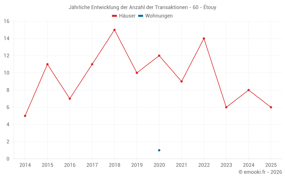 Der Durchschnittspreis auf den 17 Hausgeschäften der letzten 24 Monate in der Gemeinde Étouy betrug 1 991 € pro Quadratmeter für einen mittleren Immobilienwert von 184 000 €. Über diesen Zeitraum hinweg lagen 60% der Transaktionen zwischen 1 674 und 2 589 € pro Quadratmeter (vom 2. bis zum 8. Dezil).