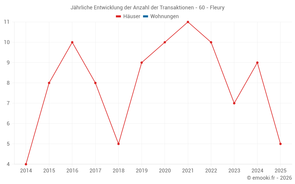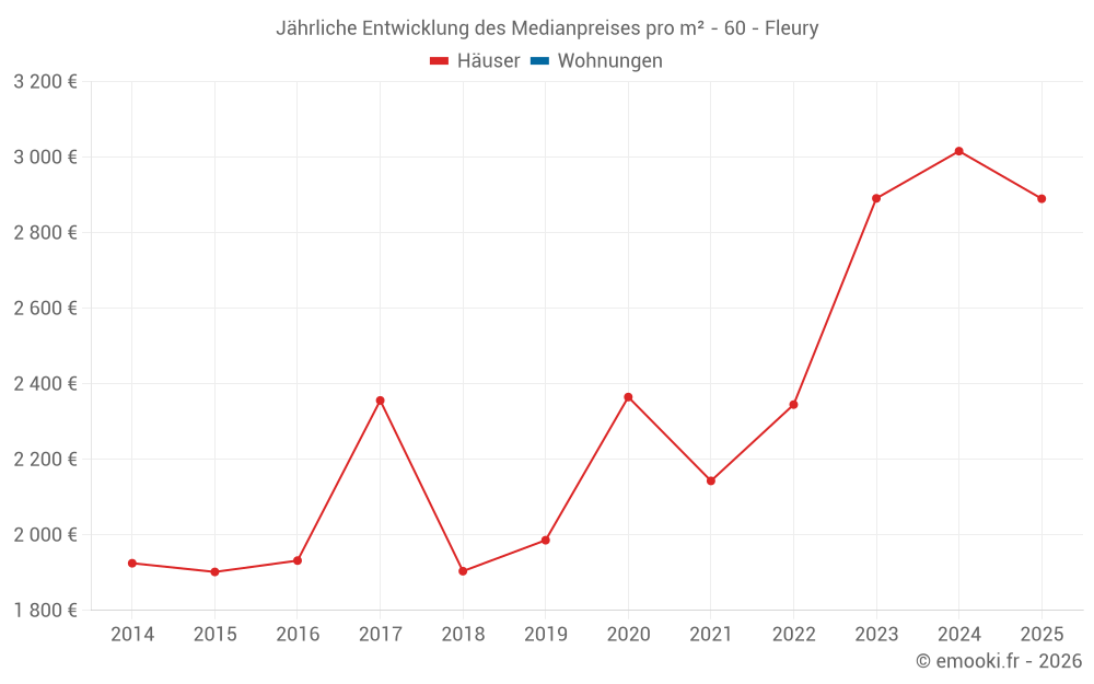 Der Durchschnittspreis auf den 18 Hausgeschäften der letzten 24 Monate in der Gemeinde Fleury betrug 2 934 € pro Quadratmeter für einen mittleren Immobilienwert von 236 000 €. Über diesen Zeitraum hinweg lagen 60% der Transaktionen zwischen 2 610 und 3 296 € pro Quadratmeter (vom 2. bis zum 8. Dezil).