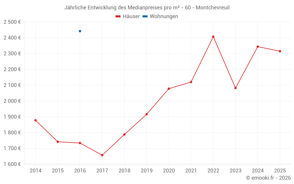 Der Durchschnittspreis auf den 24 Hausgeschäften der letzten 24 Monate in der Gemeinde Montchevreuil betrug 2 330 € pro Quadratmeter für einen mittleren Immobilienwert von 216 500 €. Über diesen Zeitraum hinweg lagen 60% der Transaktionen zwischen 1 833 und 3 214 € pro Quadratmeter (vom 2. bis zum 8. Dezil).