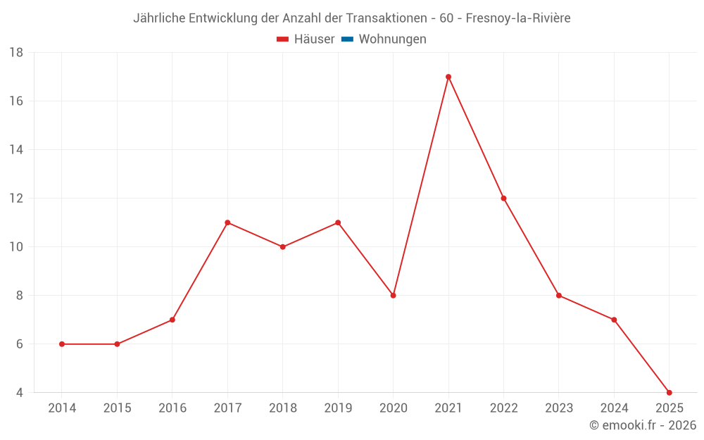 Der Durchschnittspreis auf den 16 Hausgeschäften der letzten 24 Monate in der Gemeinde Fresnoy-la-Rivière betrug 2 280 € pro Quadratmeter für einen mittleren Immobilienwert von 238 025 €. Über diesen Zeitraum hinweg lagen 60% der Transaktionen zwischen 1 675 und 2 904 € pro Quadratmeter (vom 2. bis zum 8. Dezil).