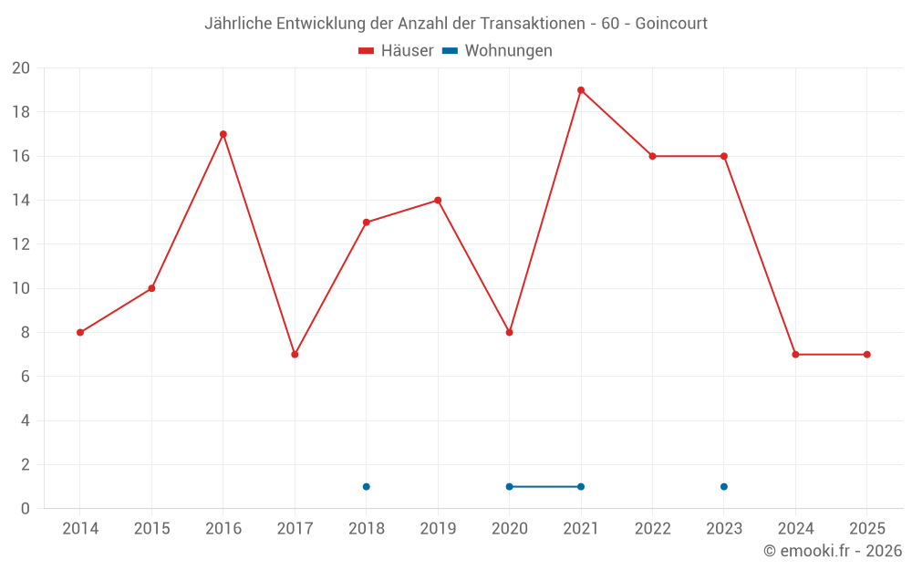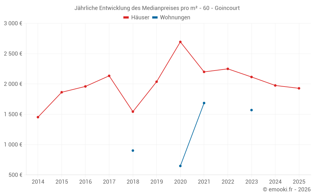 Der Durchschnittspreis auf den 23 Hausgeschäften der letzten 24 Monate in der Gemeinde Goincourt betrug 1 960 € pro Quadratmeter für einen mittleren Immobilienwert von 190 000 €. Über diesen Zeitraum hinweg lagen 60% der Transaktionen zwischen 1 674 und 2 323 € pro Quadratmeter (vom 2. bis zum 8. Dezil).