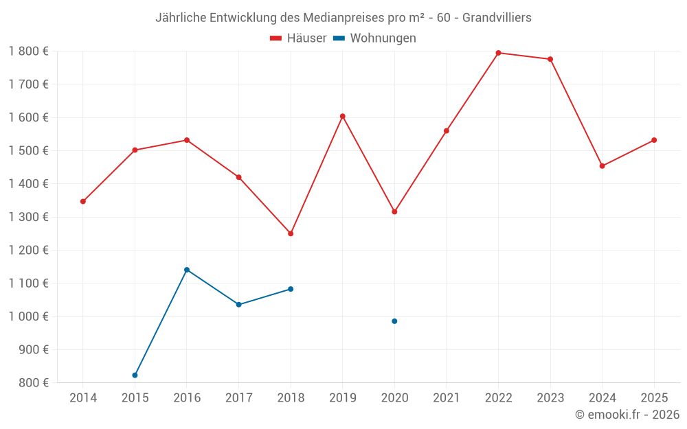 Der Durchschnittspreis auf den 25 Hausgeschäften der letzten 12 Monate in der Gemeinde Grandvilliers betrug 1 563 € pro Quadratmeter für einen mittleren Immobilienwert von 130 000 €. Über diesen Zeitraum hinweg lagen 60% der Transaktionen zwischen 1 045 und 2 053 € pro Quadratmeter (vom 2. bis zum 8. Dezil).