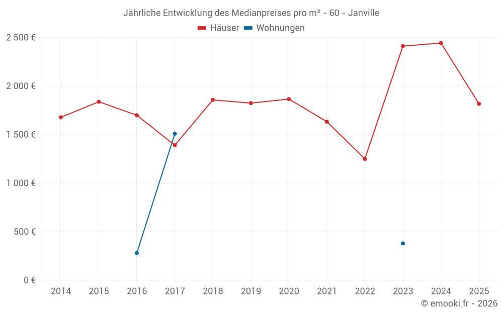 Der Durchschnittspreis auf den 15 Hausgeschäften der letzten 24 Monate in der Gemeinde Janville betrug 2 194 € pro Quadratmeter für einen mittleren Immobilienwert von 175 924 €. Über diesen Zeitraum hinweg lagen 60% der Transaktionen zwischen 1 369 und 2 688 € pro Quadratmeter (vom 2. bis zum 8. Dezil).