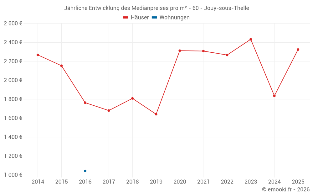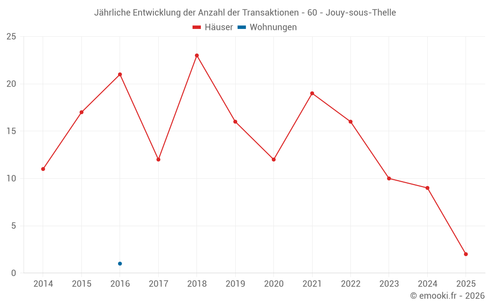 Der Durchschnittspreis auf den 16 Hausgeschäften der letzten 24 Monate in der Gemeinde Jouy-sous-Thelle betrug 1 946 € pro Quadratmeter für einen mittleren Immobilienwert von 198 750 €. Über diesen Zeitraum hinweg lagen 60% der Transaktionen zwischen 1 239 und 2 882 € pro Quadratmeter (vom 2. bis zum 8. Dezil).