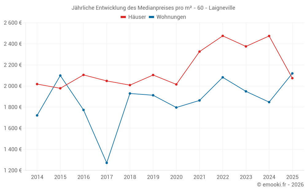 Der Durchschnittspreis auf den 22 Wohnungstransaktionen der letzten 24 Monate in der Gemeinde Laigneville betrug 1 848 € pro Quadratmeter für einen mittleren Immobilienwert von 114 500 €. Über diesen Zeitraum hinweg lagen 60% der Transaktionen zwischen 1 454 und 2 113 € pro Quadratmeter (vom 2. bis zum 8. Dezil).