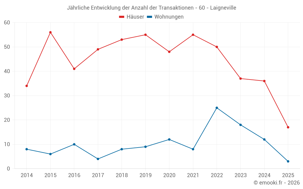 Der Durchschnittspreis auf den 38 Hausgeschäften der letzten 12 Monate in der Gemeinde Laigneville betrug 2 298 € pro Quadratmeter für einen mittleren Immobilienwert von 212 500 €. Über diesen Zeitraum hinweg lagen 60% der Transaktionen zwischen 1 851 und 2 662 € pro Quadratmeter (vom 2. bis zum 8. Dezil).