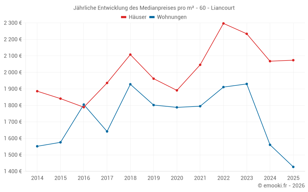Der Durchschnittspreis auf den 22 Wohnungstransaktionen der letzten 12 Monate in der Gemeinde Liancourt betrug 1 428 € pro Quadratmeter für einen mittleren Immobilienwert von 93 750 €. Über diesen Zeitraum hinweg lagen 60% der Transaktionen zwischen 1 104 und 1 896 € pro Quadratmeter (vom 2. bis zum 8. Dezil).