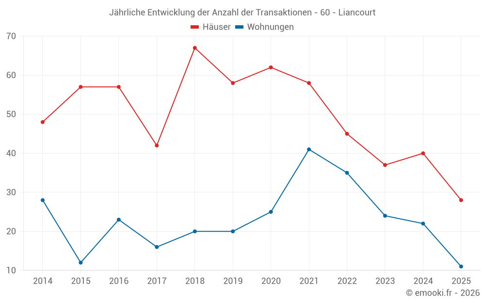 Der Durchschnittspreis auf den 28 Hausgeschäften der letzten 6 Monate in der Gemeinde Liancourt betrug 2 074 € pro Quadratmeter für einen mittleren Immobilienwert von 169 000 €. Über diesen Zeitraum hinweg lagen 60% der Transaktionen zwischen 1 725 und 2 465 € pro Quadratmeter (vom 2. bis zum 8. Dezil).