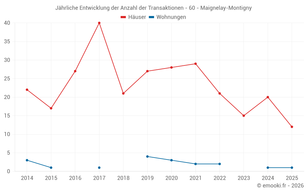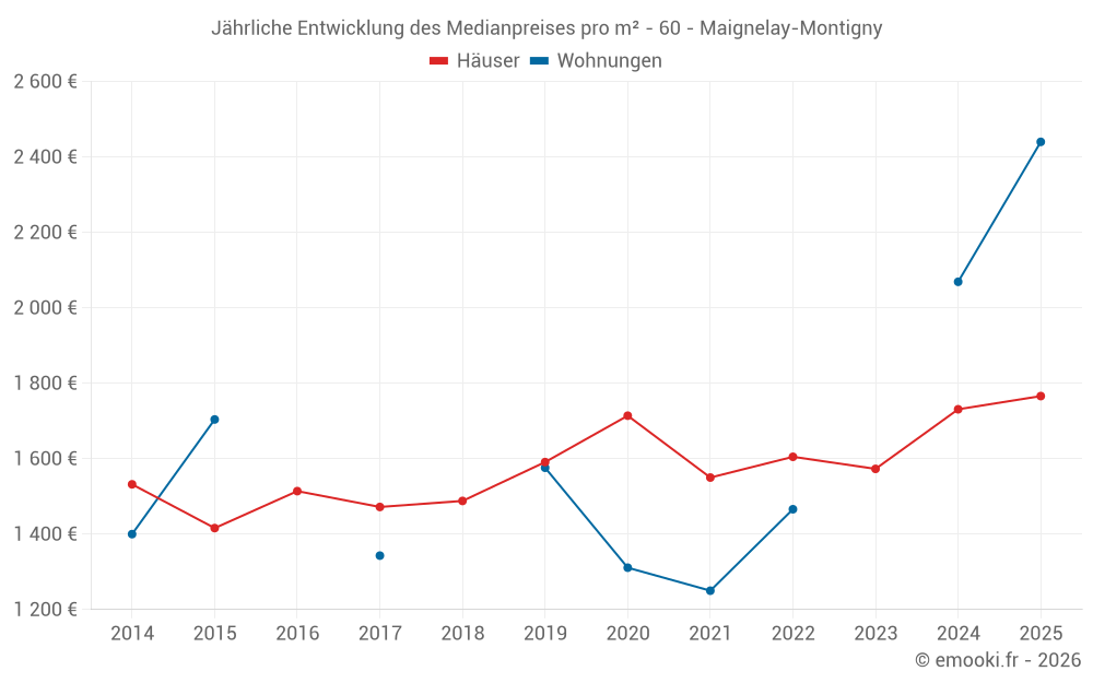 Der Durchschnittspreis auf den 27 Hausgeschäften der letzten 12 Monate in der Gemeinde Maignelay-Montigny betrug 1 769 € pro Quadratmeter für einen mittleren Immobilienwert von 166 000 €. Über diesen Zeitraum hinweg lagen 60% der Transaktionen zwischen 1 145 und 2 116 € pro Quadratmeter (vom 2. bis zum 8. Dezil).