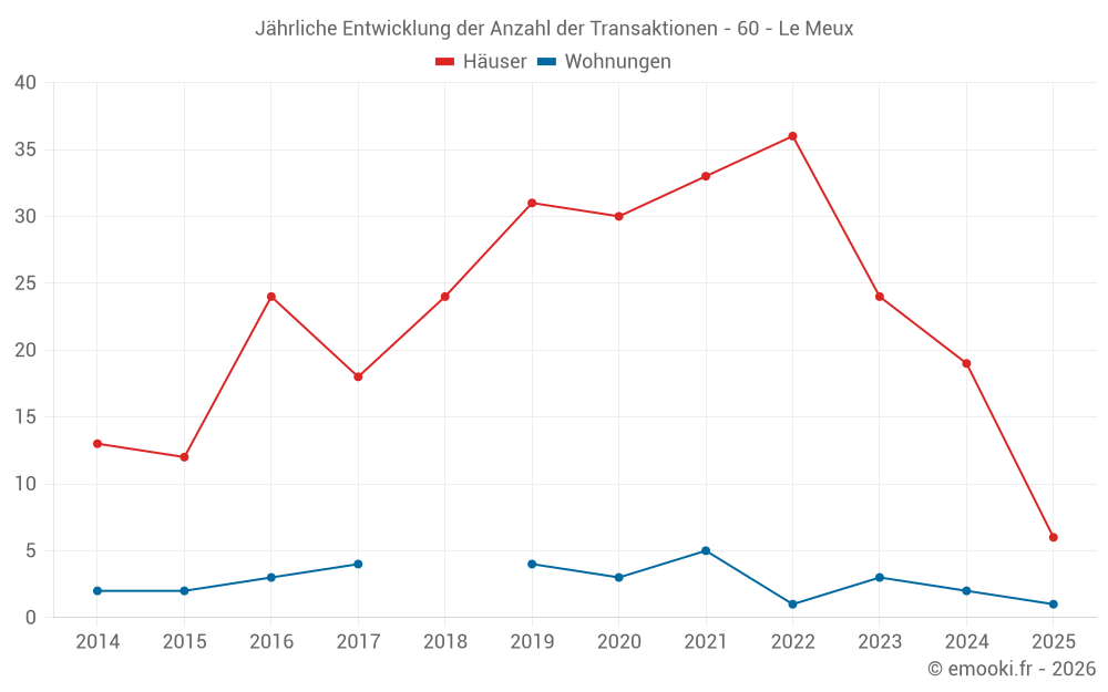 Der Durchschnittspreis auf den 41 Hausgeschäften der letzten 24 Monate in der Gemeinde Le Meux betrug 2 336 € pro Quadratmeter für einen mittleren Immobilienwert von 242 000 €. Über diesen Zeitraum hinweg lagen 60% der Transaktionen zwischen 1 904 und 3 068 € pro Quadratmeter (vom 2. bis zum 8. Dezil).