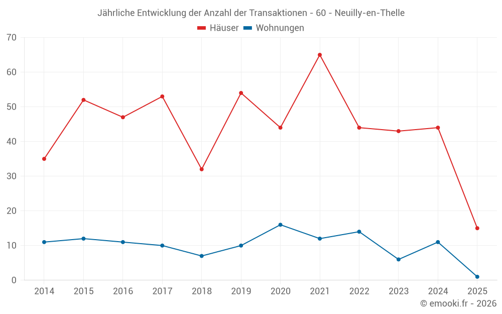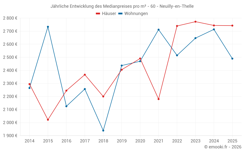 Der Durchschnittspreis auf den 37 Hausgeschäften der letzten 12 Monate in der Gemeinde Neuilly-en-Thelle betrug 2 743 € pro Quadratmeter für einen mittleren Immobilienwert von 250 000 €. Über diesen Zeitraum hinweg lagen 60% der Transaktionen zwischen 2 274 und 3 049 € pro Quadratmeter (vom 2. bis zum 8. Dezil).