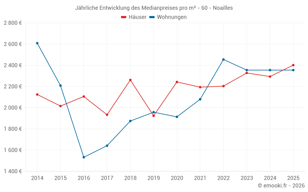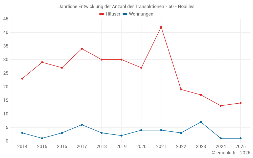 Der Durchschnittspreis auf den 24 Hausgeschäften der letzten 12 Monate in der Gemeinde Noailles betrug 2 402 € pro Quadratmeter für einen mittleren Immobilienwert von 215 000 €. Über diesen Zeitraum hinweg lagen 60% der Transaktionen zwischen 1 787 und 3 071 € pro Quadratmeter (vom 2. bis zum 8. Dezil).