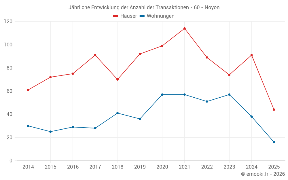 Der Durchschnittspreis auf den 37 Wohnungstransaktionen der letzten 12 Monate in der Gemeinde Noyon betrug 956 € pro Quadratmeter für einen mittleren Immobilienwert von 58 000 €. Über diesen Zeitraum hinweg lagen 60% der Transaktionen zwischen 630 und 1 470 € pro Quadratmeter (vom 2. bis zum 8. Dezil).