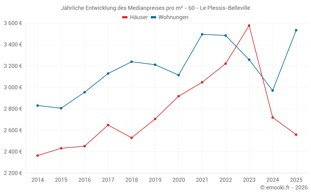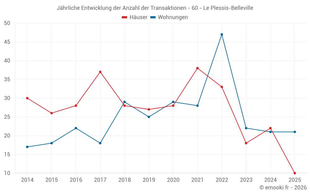 Der Durchschnittspreis auf den 23 Hausgeschäften der letzten 12 Monate in der Gemeinde Le Plessis-Belleville betrug 2 567 € pro Quadratmeter für einen mittleren Immobilienwert von 250 000 €. Über diesen Zeitraum hinweg lagen 60% der Transaktionen zwischen 2 254 und 3 527 € pro Quadratmeter (vom 2. bis zum 8. Dezil).