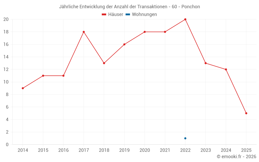 Der Durchschnittspreis auf den 23 Hausgeschäften der letzten 24 Monate in der Gemeinde Ponchon betrug 2 240 € pro Quadratmeter für einen mittleren Immobilienwert von 215 000 €. Über diesen Zeitraum hinweg lagen 60% der Transaktionen zwischen 1 736 und 2 417 € pro Quadratmeter (vom 2. bis zum 8. Dezil).
