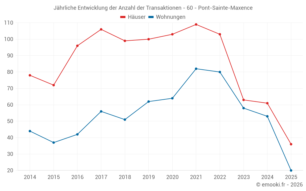 Der Durchschnittspreis auf den 36 Hausgeschäften der letzten 6 Monate in der Gemeinde Pont-Sainte-Maxence betrug 2 218 € pro Quadratmeter für einen mittleren Immobilienwert von 212 000 €. Über diesen Zeitraum hinweg lagen 60% der Transaktionen zwischen 1 953 und 2 879 € pro Quadratmeter (vom 2. bis zum 8. Dezil).