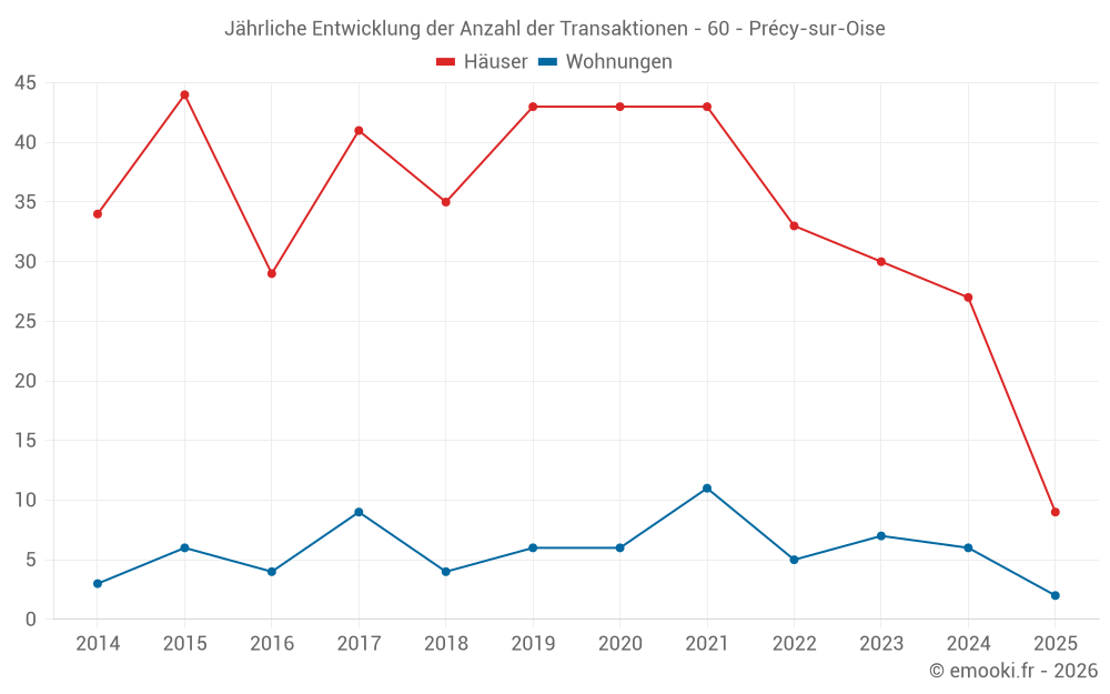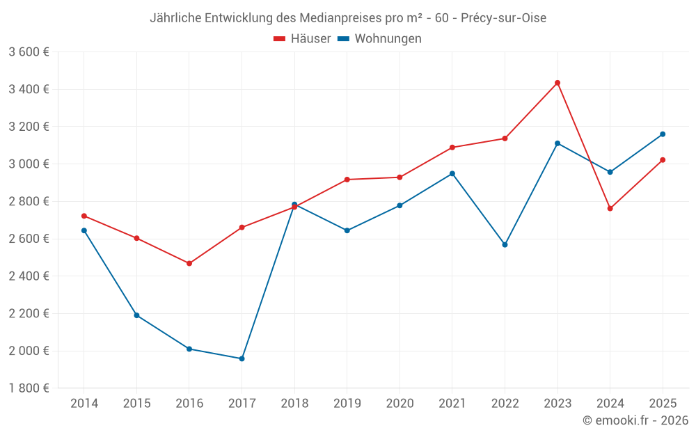 Der Durchschnittspreis auf den 23 Hausgeschäften der letzten 12 Monate in der Gemeinde Précy-sur-Oise betrug 2 845 € pro Quadratmeter für einen mittleren Immobilienwert von 280 000 €. Über diesen Zeitraum hinweg lagen 60% der Transaktionen zwischen 2 110 und 3 287 € pro Quadratmeter (vom 2. bis zum 8. Dezil).