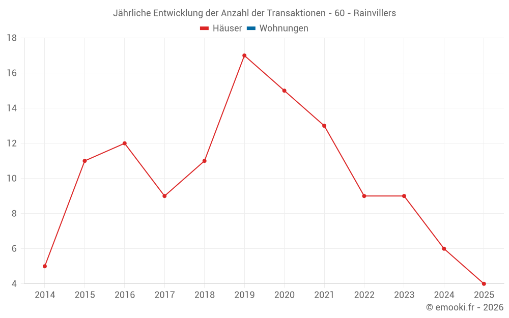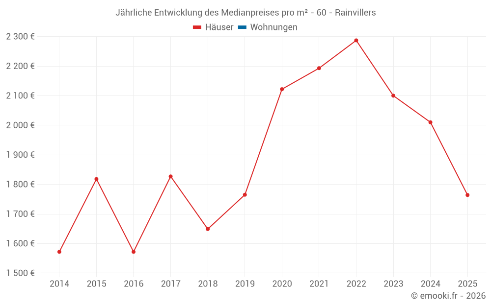 Der Durchschnittspreis auf den 16 Hausgeschäften der letzten 24 Monate in der Gemeinde Rainvillers betrug 1 884 € pro Quadratmeter für einen mittleren Immobilienwert von 182 500 €. Über diesen Zeitraum hinweg lagen 60% der Transaktionen zwischen 1 320 und 2 184 € pro Quadratmeter (vom 2. bis zum 8. Dezil).