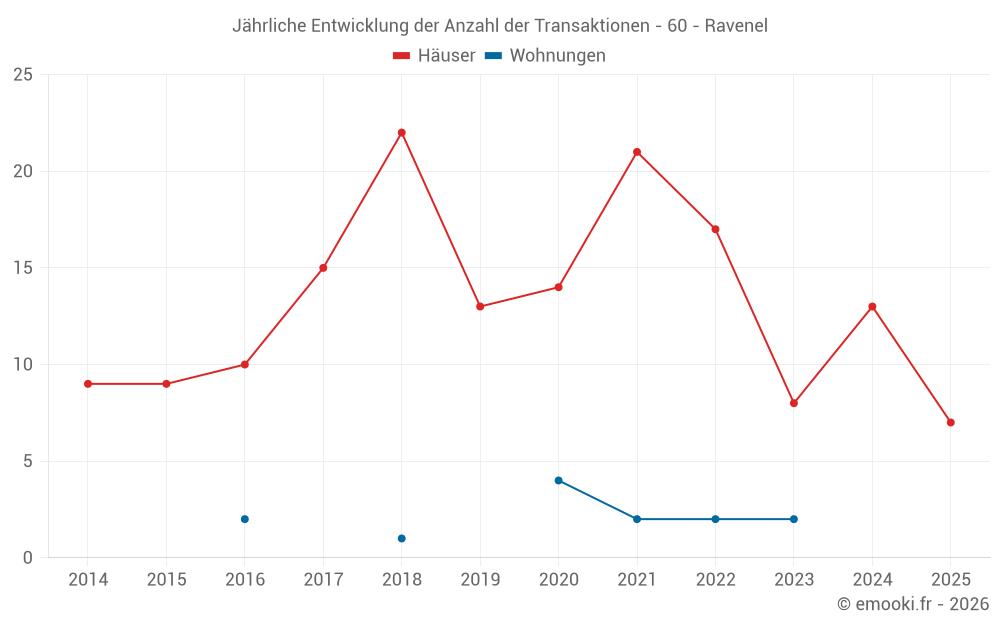 Der Durchschnittspreis auf den 23 Hausgeschäften der letzten 24 Monate in der Gemeinde Ravenel betrug 1 675 € pro Quadratmeter für einen mittleren Immobilienwert von 139 000 €. Über diesen Zeitraum hinweg lagen 60% der Transaktionen zwischen 1 292 und 1 982 € pro Quadratmeter (vom 2. bis zum 8. Dezil).