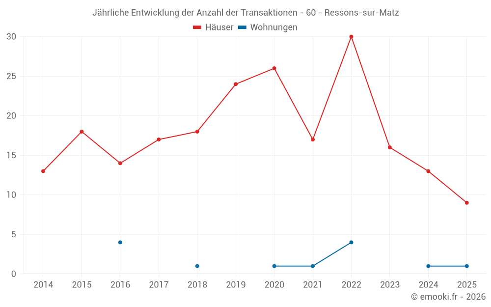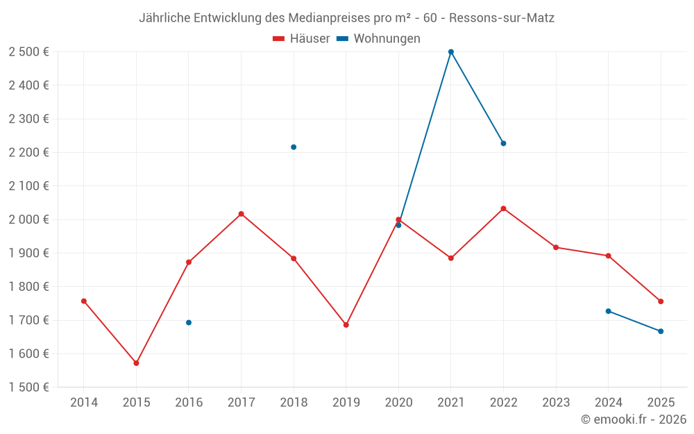 Der Durchschnittspreis auf den 20 Hausgeschäften der letzten 12 Monate in der Gemeinde Ressons-sur-Matz betrug 1 780 € pro Quadratmeter für einen mittleren Immobilienwert von 142 000 €. Über diesen Zeitraum hinweg lagen 60% der Transaktionen zwischen 1 331 und 2 370 € pro Quadratmeter (vom 2. bis zum 8. Dezil).