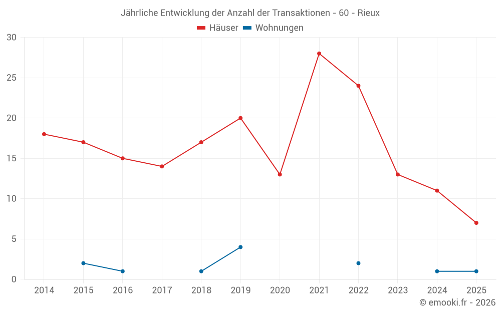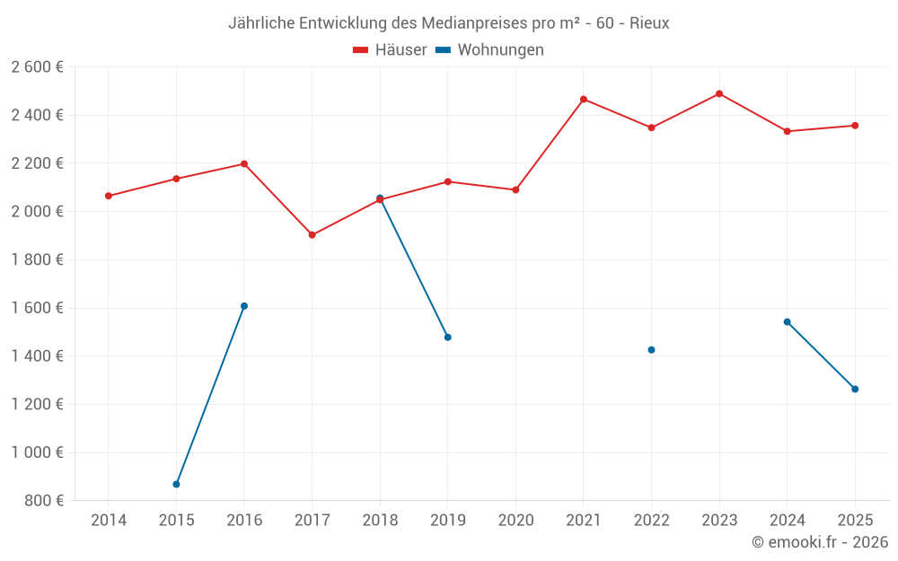 Der Durchschnittspreis auf den 22 Hausgeschäften der letzten 24 Monate in der Gemeinde Rieux betrug 2 345 € pro Quadratmeter für einen mittleren Immobilienwert von 182 500 €. Über diesen Zeitraum hinweg lagen 60% der Transaktionen zwischen 2 017 und 2 636 € pro Quadratmeter (vom 2. bis zum 8. Dezil).