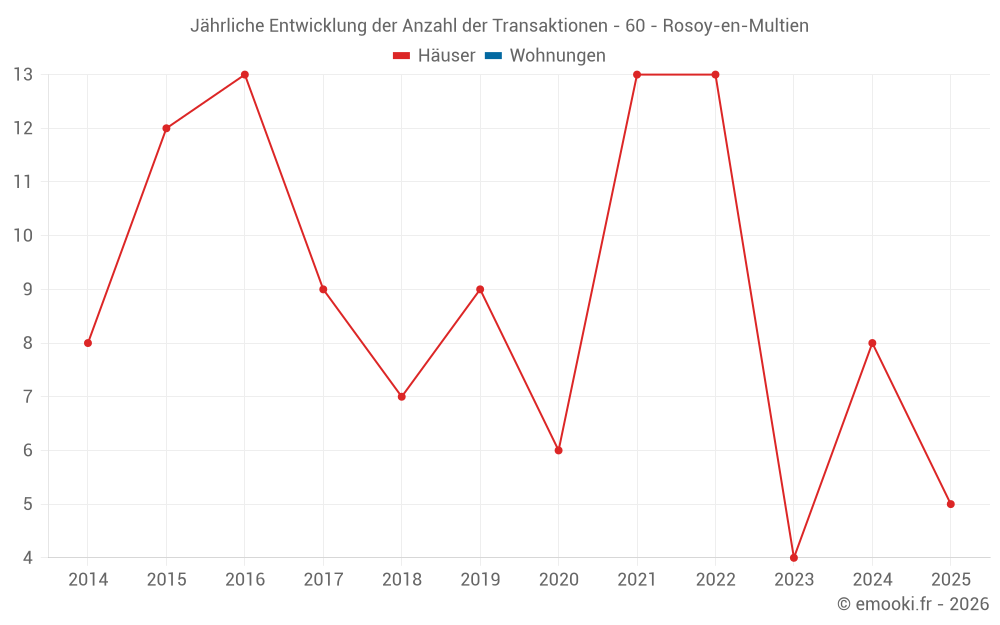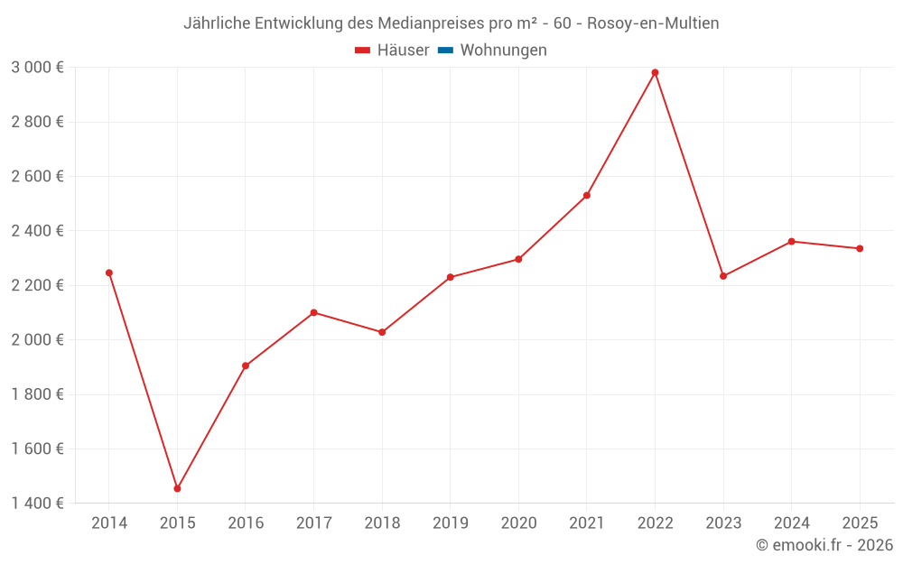 Der Durchschnittspreis auf den 16 Hausgeschäften der letzten 24 Monate in der Gemeinde Rosoy-en-Multien betrug 2 318 € pro Quadratmeter für einen mittleren Immobilienwert von 229 400 €. Über diesen Zeitraum hinweg lagen 60% der Transaktionen zwischen 1 520 und 2 714 € pro Quadratmeter (vom 2. bis zum 8. Dezil).
