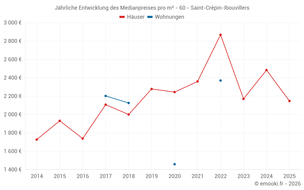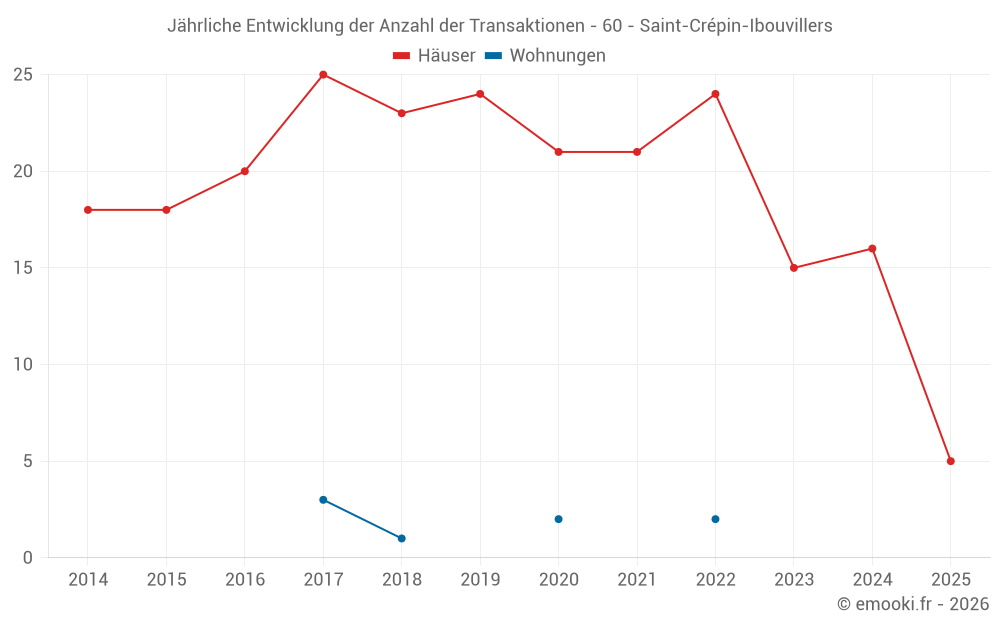 Der Durchschnittspreis auf den 17 Hausgeschäften der letzten 12 Monate in der Gemeinde Saint-Crépin-Ibouvillers betrug 2 412 € pro Quadratmeter für einen mittleren Immobilienwert von 246 000 €. Über diesen Zeitraum hinweg lagen 60% der Transaktionen zwischen 2 128 und 2 882 € pro Quadratmeter (vom 2. bis zum 8. Dezil).