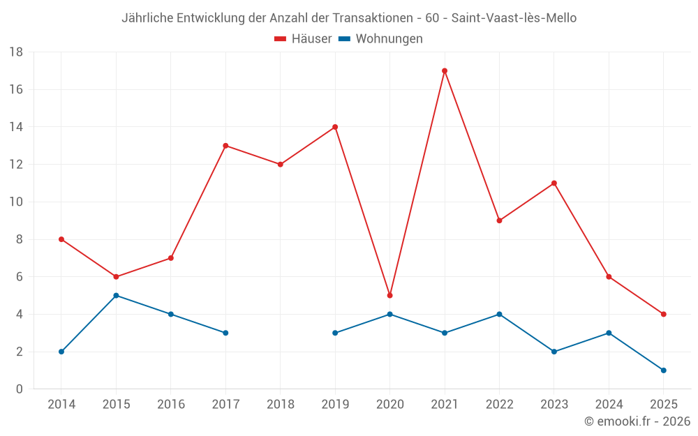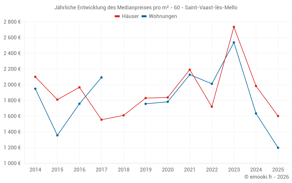 Der Durchschnittspreis auf den 16 Hausgeschäften der letzten 24 Monate in der Gemeinde Saint-Vaast-lès-Mello betrug 2 092 € pro Quadratmeter für einen mittleren Immobilienwert von 197 100 €. Über diesen Zeitraum hinweg lagen 60% der Transaktionen zwischen 1 150 und 2 500 € pro Quadratmeter (vom 2. bis zum 8. Dezil).