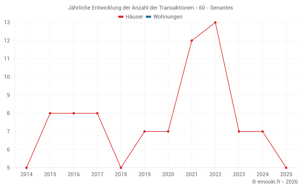 Der Durchschnittspreis auf den 15 Hausgeschäften der letzten 24 Monate in der Gemeinde Senantes betrug 1 779 € pro Quadratmeter für einen mittleren Immobilienwert von 159 000 €. Über diesen Zeitraum hinweg lagen 60% der Transaktionen zwischen 1 415 und 2 158 € pro Quadratmeter (vom 2. bis zum 8. Dezil).