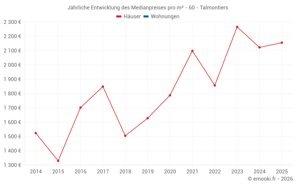Der Durchschnittspreis auf den 17 Hausgeschäften der letzten 24 Monate in der Gemeinde Talmontiers betrug 2 123 € pro Quadratmeter für einen mittleren Immobilienwert von 190 000 €. Über diesen Zeitraum hinweg lagen 60% der Transaktionen zwischen 1 841 und 2 500 € pro Quadratmeter (vom 2. bis zum 8. Dezil).