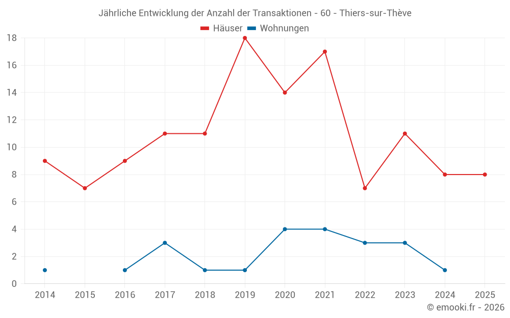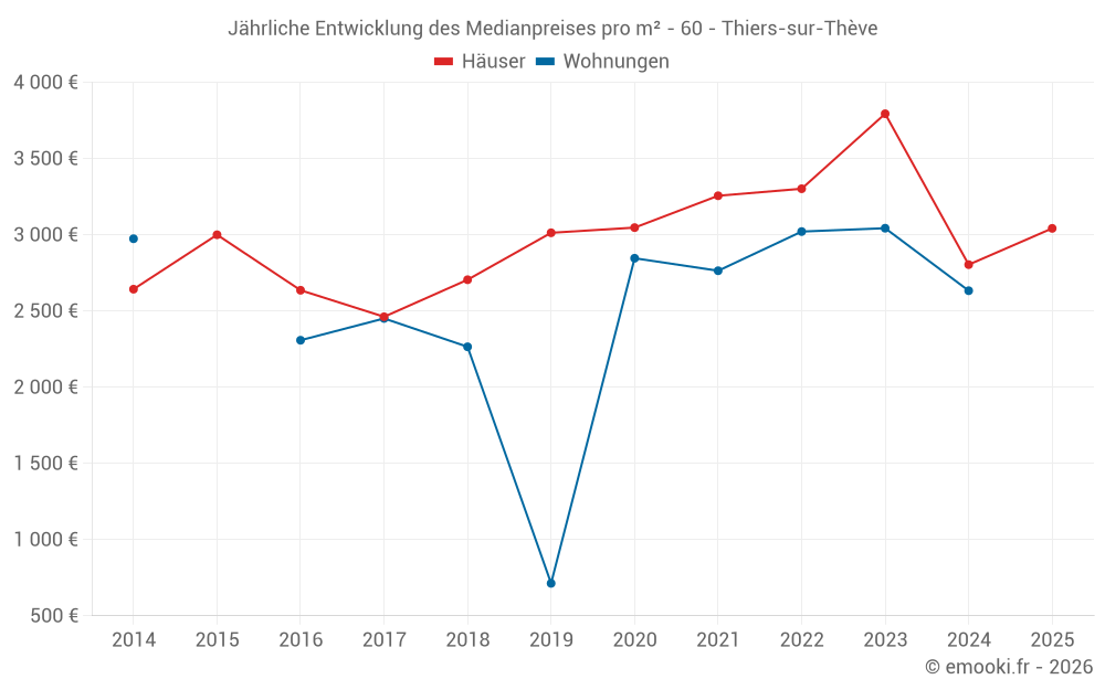 Der Durchschnittspreis auf den 21 Hausgeschäften der letzten 24 Monate in der Gemeinde Thiers-sur-Thève betrug 3 200 € pro Quadratmeter für einen mittleren Immobilienwert von 325 000 €. Über diesen Zeitraum hinweg lagen 60% der Transaktionen zwischen 2 500 und 4 602 € pro Quadratmeter (vom 2. bis zum 8. Dezil).