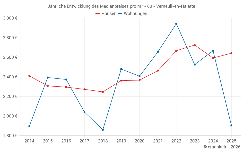 Der Durchschnittspreis auf den 15 Wohnungstransaktionen der letzten 24 Monate in der Gemeinde Verneuil-en-Halatte betrug 2 381 € pro Quadratmeter für einen mittleren Immobilienwert von 160 000 €. Über diesen Zeitraum hinweg lagen 60% der Transaktionen zwischen 1 721 und 2 598 € pro Quadratmeter (vom 2. bis zum 8. Dezil).