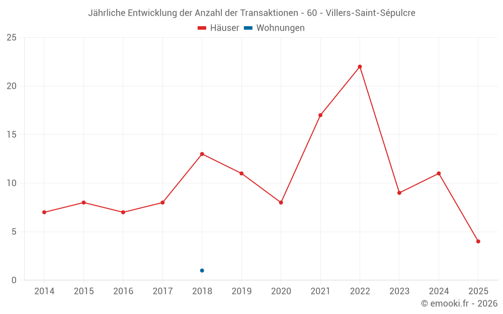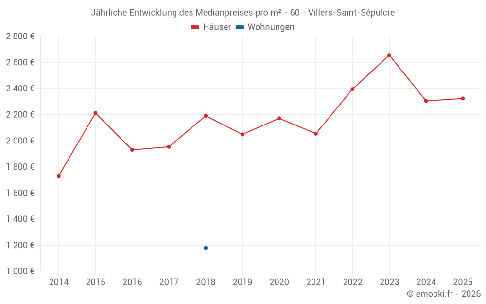 Der Durchschnittspreis auf den 19 Hausgeschäften der letzten 24 Monate in der Gemeinde Villers-Saint-Sépulcre betrug 2 305 € pro Quadratmeter für einen mittleren Immobilienwert von 196 000 €. Über diesen Zeitraum hinweg lagen 60% der Transaktionen zwischen 1 861 und 2 701 € pro Quadratmeter (vom 2. bis zum 8. Dezil).