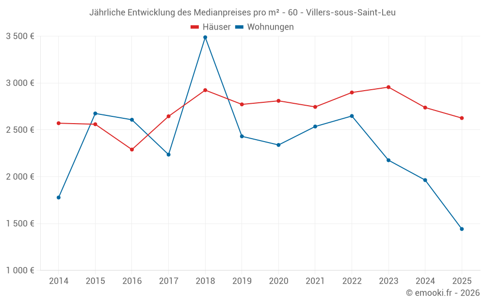 Der Durchschnittspreis auf den 19 Hausgeschäften der letzten 12 Monate in der Gemeinde Villers-sous-Saint-Leu betrug 2 712 € pro Quadratmeter für einen mittleren Immobilienwert von 300 000 €. Über diesen Zeitraum hinweg lagen 60% der Transaktionen zwischen 2 344 und 3 266 € pro Quadratmeter (vom 2. bis zum 8. Dezil).