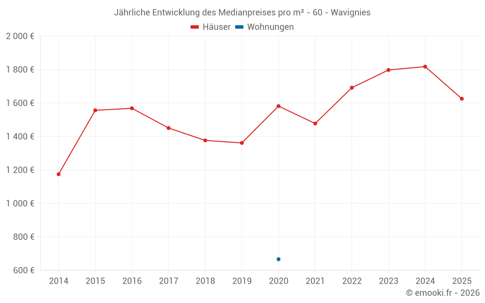 Der Durchschnittspreis auf den 25 Hausgeschäften der letzten 24 Monate in der Gemeinde Wavignies betrug 1 799 € pro Quadratmeter für einen mittleren Immobilienwert von 176 946 €. Über diesen Zeitraum hinweg lagen 60% der Transaktionen zwischen 1 286 und 2 079 € pro Quadratmeter (vom 2. bis zum 8. Dezil).