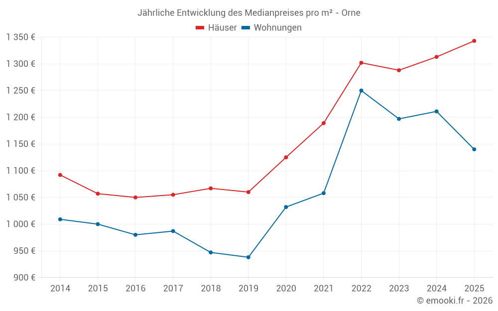 Der Durchschnittspreis auf den 164 Wohnungstransaktionen der letzten 6 Monate im Orne-Departement betrug 1 140 € pro Quadratmeter für einen mittleren Immobilienwert von 61 750 €. Über diesen Zeitraum hinweg lagen 60% der Transaktionen zwischen 732 und 1 769 € pro Quadratmeter (vom 2. bis zum 8. Dezil).