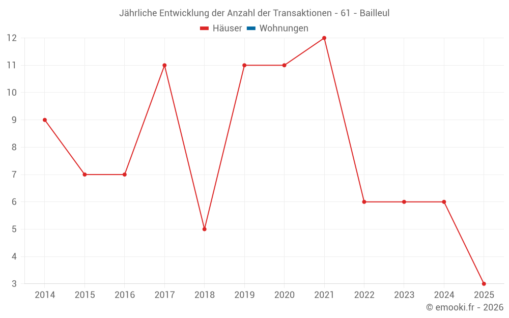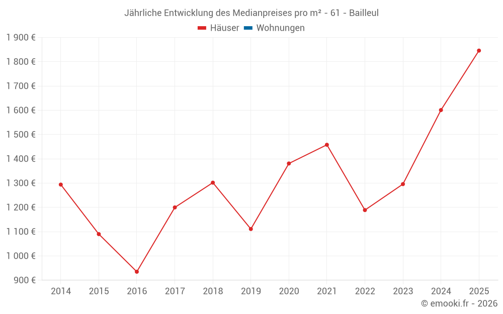 Der Durchschnittspreis auf den 14 Hausgeschäften der letzten 24 Monate in der Gemeinde Bailleul betrug 1 601 € pro Quadratmeter für einen mittleren Immobilienwert von 142 500 €. Über diesen Zeitraum hinweg lagen 60% der Transaktionen zwischen 1 301 und 1 802 € pro Quadratmeter (vom 2. bis zum 8. Dezil).