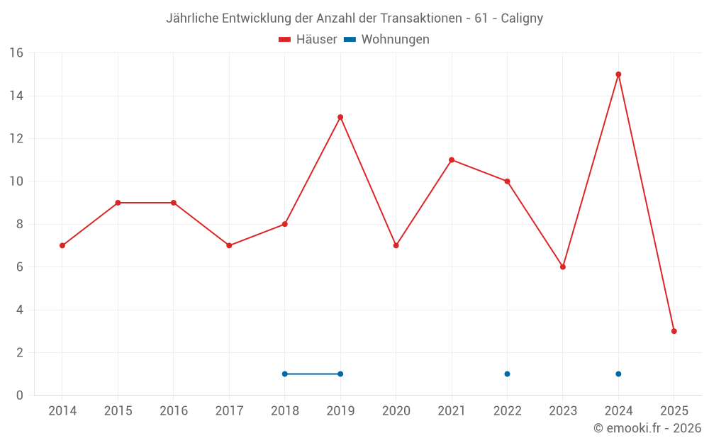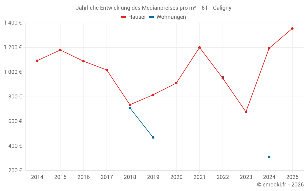 Der Durchschnittspreis auf den 21 Hausgeschäften der letzten 24 Monate in der Gemeinde Caligny betrug 1 095 € pro Quadratmeter für einen mittleren Immobilienwert von 90 000 €. Über diesen Zeitraum hinweg lagen 60% der Transaktionen zwischen 637 und 1 570 € pro Quadratmeter (vom 2. bis zum 8. Dezil).