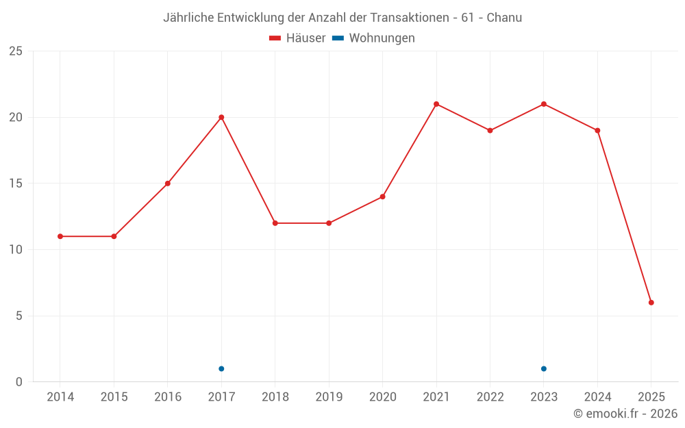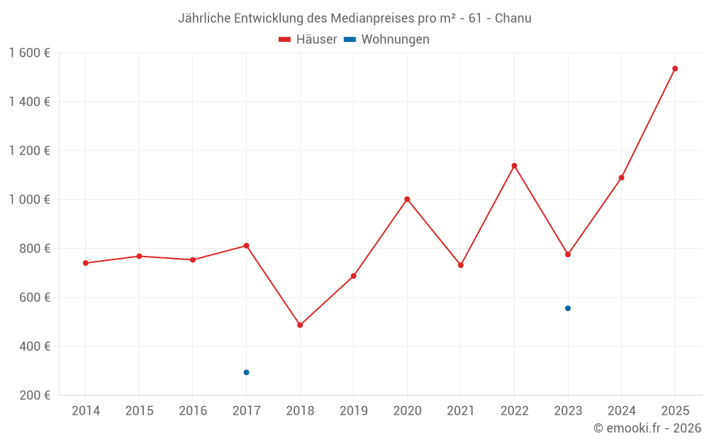 Der Durchschnittspreis auf den 16 Hausgeschäften der letzten 12 Monate in der Gemeinde Chanu betrug 1 214 € pro Quadratmeter für einen mittleren Immobilienwert von 87 500 €. Über diesen Zeitraum hinweg lagen 60% der Transaktionen zwischen 557 und 1 588 € pro Quadratmeter (vom 2. bis zum 8. Dezil).