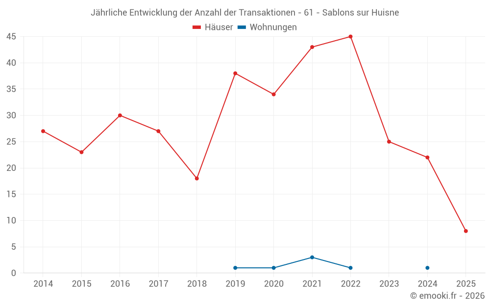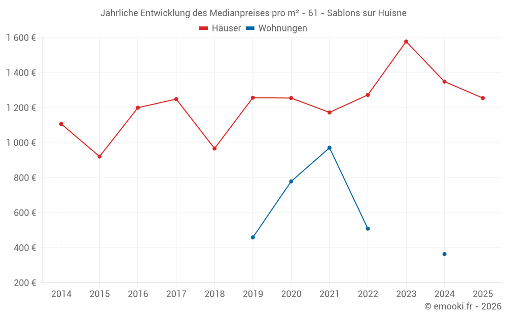 Der Durchschnittspreis auf den 19 Hausgeschäften der letzten 12 Monate in der Gemeinde Sablons sur Huisne betrug 1 277 € pro Quadratmeter für einen mittleren Immobilienwert von 106 000 €. Über diesen Zeitraum hinweg lagen 60% der Transaktionen zwischen 835 und 1 978 € pro Quadratmeter (vom 2. bis zum 8. Dezil).