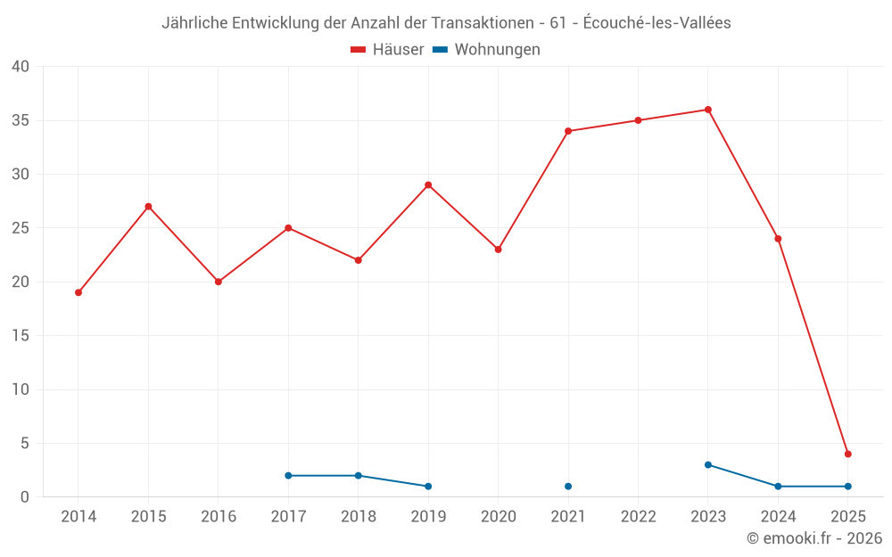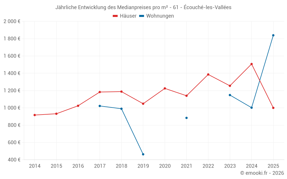 Der Durchschnittspreis auf den 19 Hausgeschäften der letzten 12 Monate in der Gemeinde Écouché-les-Vallées betrug 1 486 € pro Quadratmeter für einen mittleren Immobilienwert von 124 000 €. Über diesen Zeitraum hinweg lagen 60% der Transaktionen zwischen 741 und 1 790 € pro Quadratmeter (vom 2. bis zum 8. Dezil).