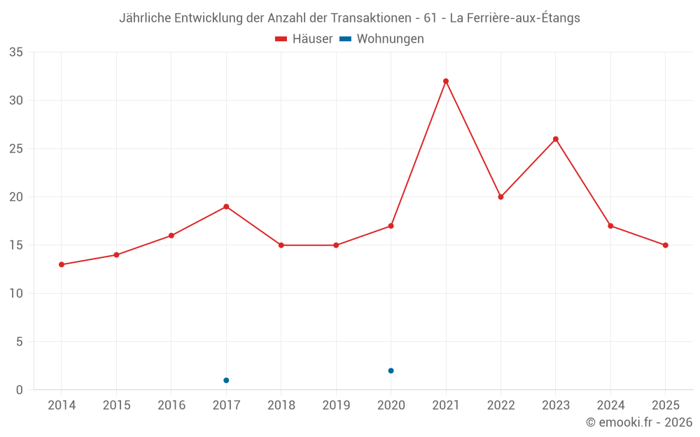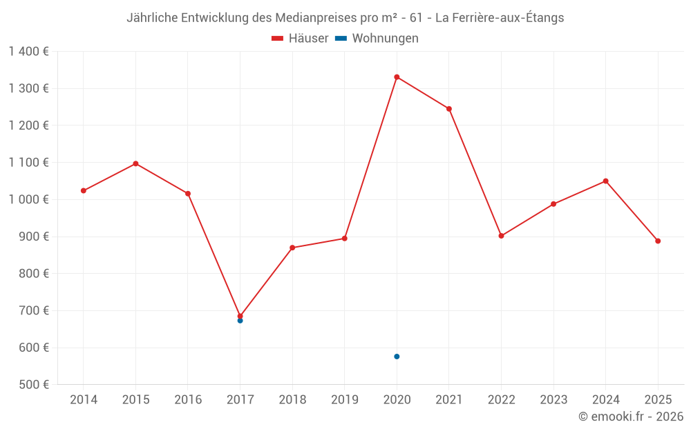 Der Durchschnittspreis auf den 25 Hausgeschäften der letzten 12 Monate in der Gemeinde La Ferrière-aux-Étangs betrug 915 € pro Quadratmeter für einen mittleren Immobilienwert von 75 000 €. Über diesen Zeitraum hinweg lagen 60% der Transaktionen zwischen 596 und 1 379 € pro Quadratmeter (vom 2. bis zum 8. Dezil).