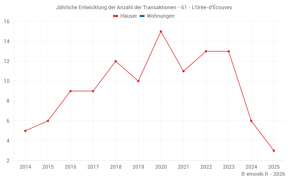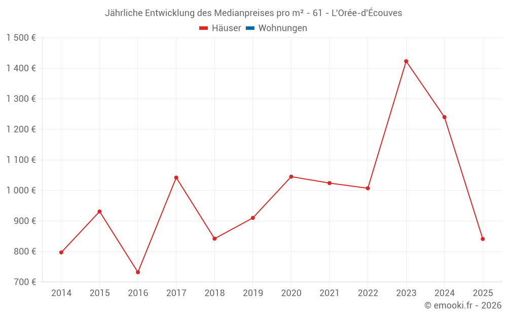 Der Durchschnittspreis auf den 17 Hausgeschäften der letzten 24 Monate in der Gemeinde L'Orée-d'Écouves betrug 1 207 € pro Quadratmeter für einen mittleren Immobilienwert von 111 000 €. Über diesen Zeitraum hinweg lagen 60% der Transaktionen zwischen 851 und 1 711 € pro Quadratmeter (vom 2. bis zum 8. Dezil).