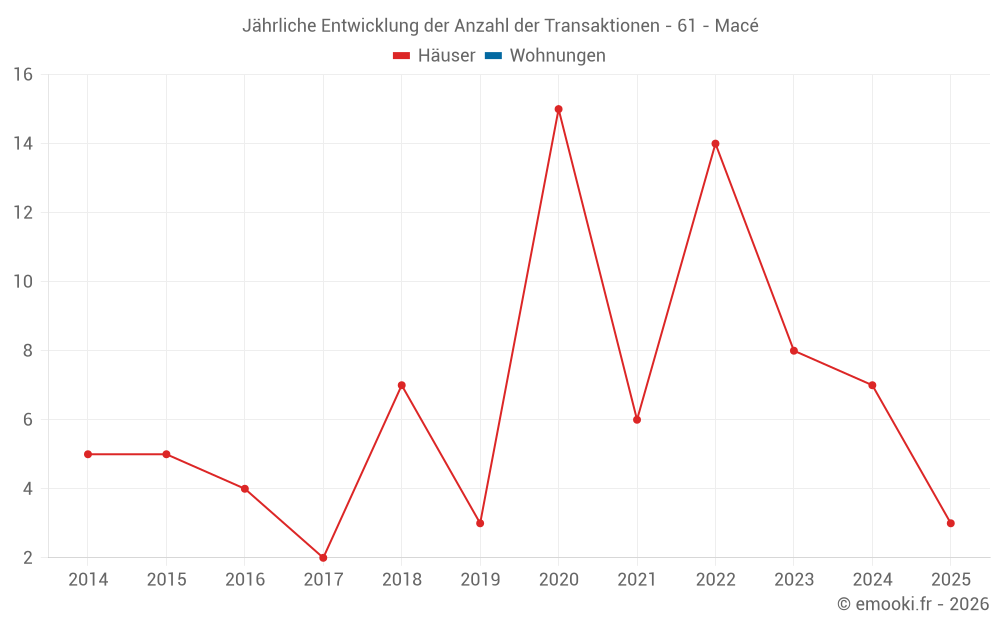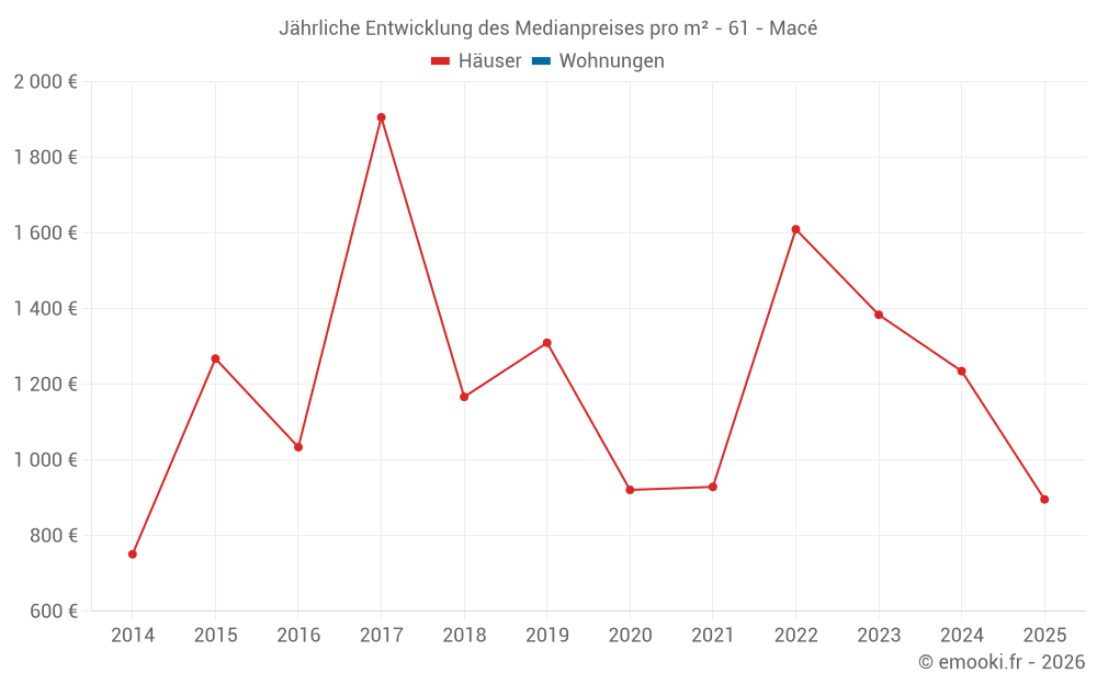 Der Durchschnittspreis auf den 16 Hausgeschäften der letzten 24 Monate in der Gemeinde Macé betrug 1 232 € pro Quadratmeter für einen mittleren Immobilienwert von 123 400 €. Über diesen Zeitraum hinweg lagen 60% der Transaktionen zwischen 896 und 1 577 € pro Quadratmeter (vom 2. bis zum 8. Dezil).