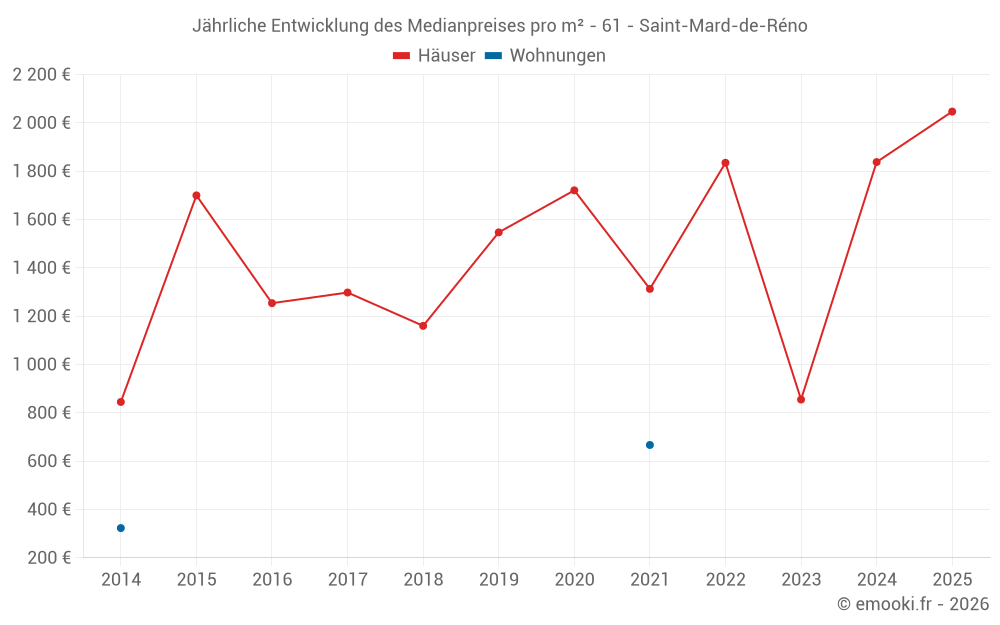 Der Durchschnittspreis auf den 16 Hausgeschäften der letzten 24 Monate in der Gemeinde Saint-Mard-de-Réno betrug 1 453 € pro Quadratmeter für einen mittleren Immobilienwert von 100 000 €. Über diesen Zeitraum hinweg lagen 60% der Transaktionen zwischen 610 und 2 222 € pro Quadratmeter (vom 2. bis zum 8. Dezil).