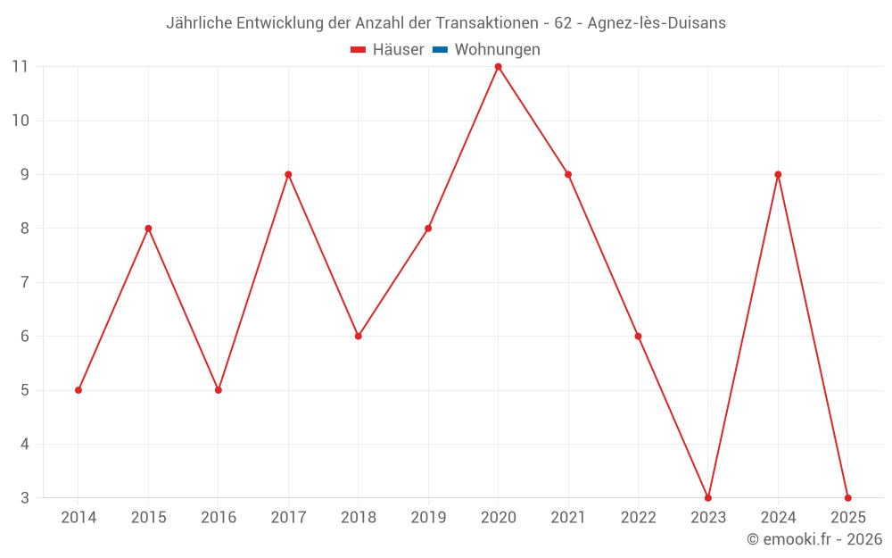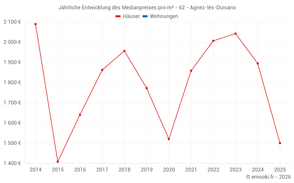 Der Durchschnittspreis auf den 14 Hausgeschäften der letzten 24 Monate in der Gemeinde Agnez-lès-Duisans betrug 1 872 € pro Quadratmeter für einen mittleren Immobilienwert von 192 500 €. Über diesen Zeitraum hinweg lagen 60% der Transaktionen zwischen 1 473 und 2 220 € pro Quadratmeter (vom 2. bis zum 8. Dezil).