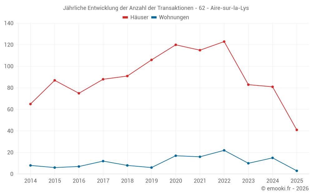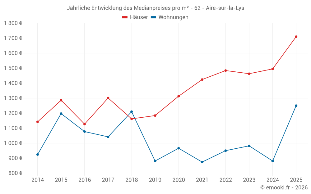 Der Durchschnittspreis auf den 41 Hausgeschäften der letzten 6 Monate in der Gemeinde Aire-sur-la-Lys betrug 1 710 € pro Quadratmeter für einen mittleren Immobilienwert von 134 000 €. Über diesen Zeitraum hinweg lagen 60% der Transaktionen zwischen 1 111 und 1 880 € pro Quadratmeter (vom 2. bis zum 8. Dezil).