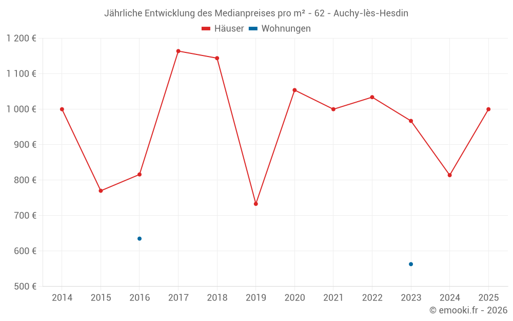 Der Durchschnittspreis auf den 21 Hausgeschäften der letzten 24 Monate in der Gemeinde Auchy-lès-Hesdin betrug 967 € pro Quadratmeter für einen mittleren Immobilienwert von 79 300 €. Über diesen Zeitraum hinweg lagen 60% der Transaktionen zwischen 647 und 1 250 € pro Quadratmeter (vom 2. bis zum 8. Dezil).